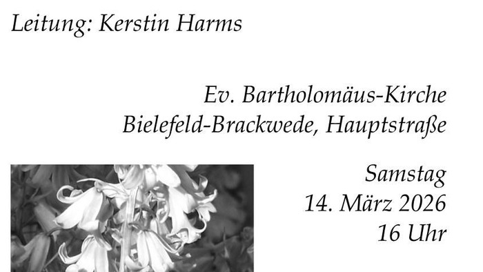 14. März 2026 Gemeinsam Frühlingslieder singen und hören. Mit Stelle Cantanti in der Bartholomäuskirche Brackwede. 16 Uhr Eintritt ist frei! Leitung: Kerstin Harms
